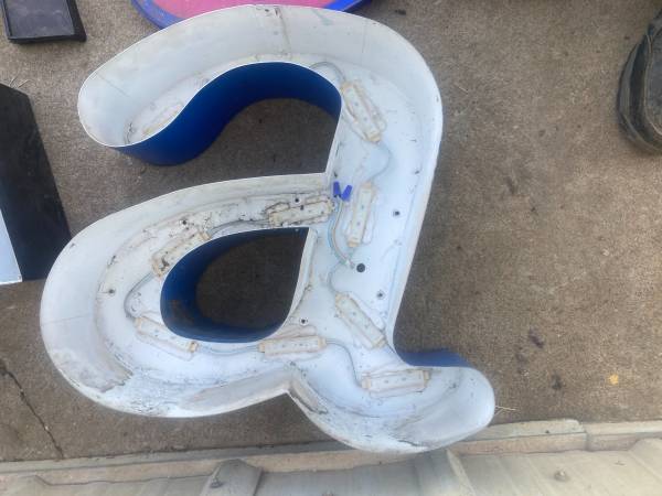 Used Lighted letter sign. Probably came from a KU or Laurence business. Do not know what they spell. I tested 1 and would not light. Might need a transformer. 1 letter cracked as shown in picture. You are getting only what is in pictures. PRICE IS FIRM